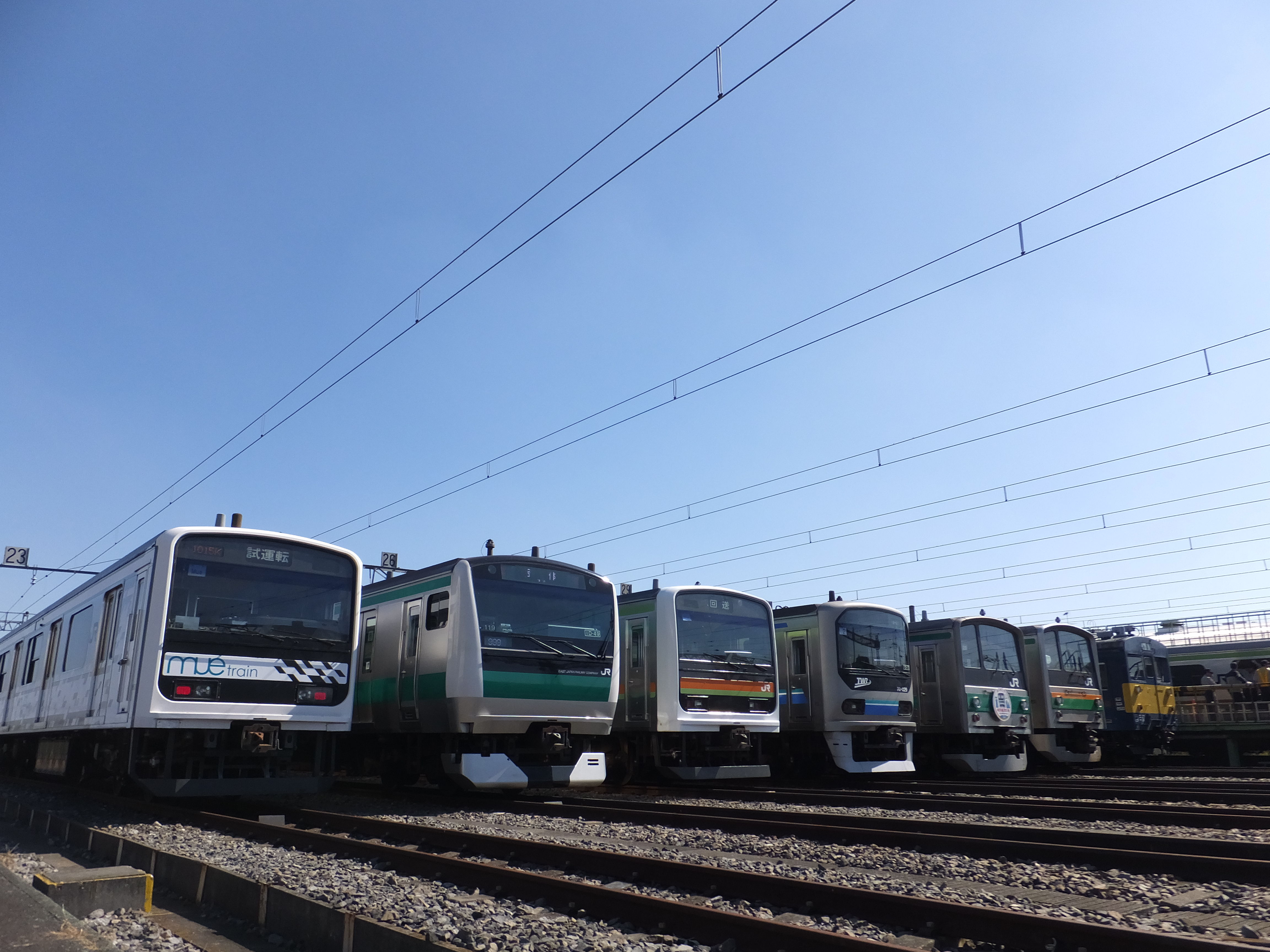 左からMueトレイン、埼京線E233系、川越線209系、りんかい線7000形、埼京線205系、東北本線205系、クモヤ143形です。